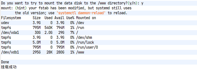 如果有购买了数据盘,则先把数据盘加载到 /www,宝塔官方提供了一个格式化数据盘并加载到 /www 目录的脚本,但是需要注意,如果机器没有新买数据盘的话,不需要运行以下脚本,因为如果检测到有数据在 /www 会自动跳过。以下脚本只适合新机器,旧机器不需要安装宝塔的,或者宝塔安装到系统盘的都无需运行。