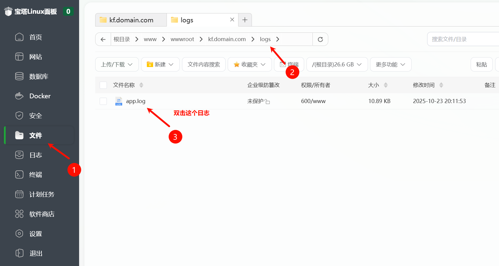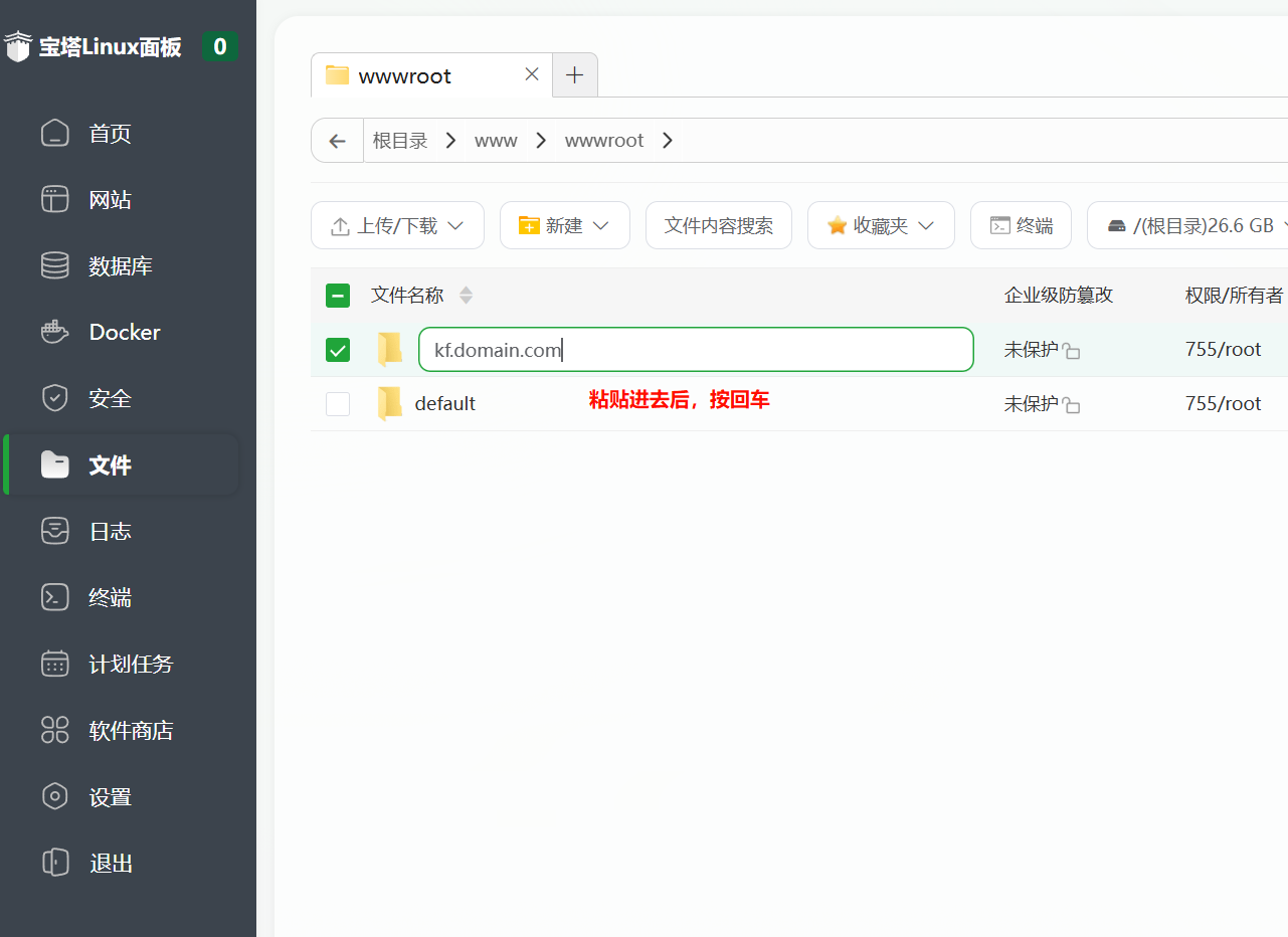宝塔面板创建站点,默认是推荐以域名为文件夹,我们这个客服系统也改成这种方式,方便多站点以后找到它容易些。因为假设域名是:kf.domain.com,那么我们去到文件管理。