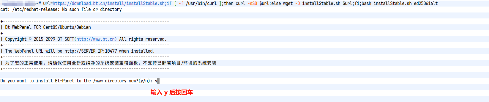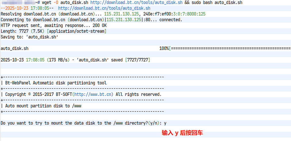 以上不管是加载数据盘到 /www 还是安装宝塔面板的操作,都是粘贴以上命令行到宝塔面板左侧的「终端」,在第一个提示按下:y,然后按回车开始安装。