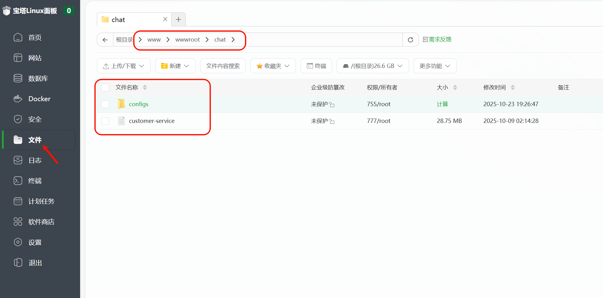 这个脚本主要功能就是,下载:http://www.5umb.com/api/v1/download/QtCodeCreators/customer-service/v2.4.0/linux-amd64.zip 这个压缩包,然后解压到:/www/wwwroot/chat,我们可以在文件管理找到。
