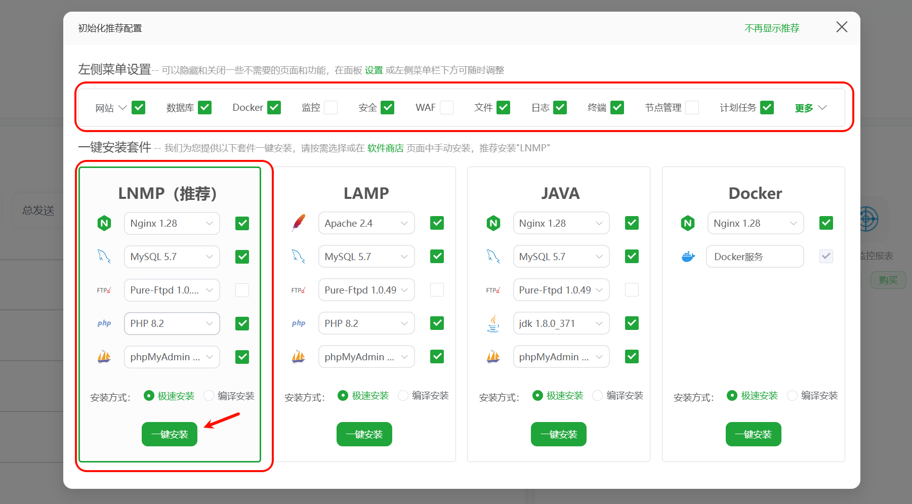 初始化一下基础的环境软件,一般这个推荐的,按照我图的去掉打勾或者选择对应的版本,也可以根据你的实际选择。