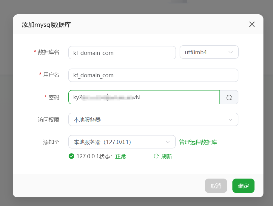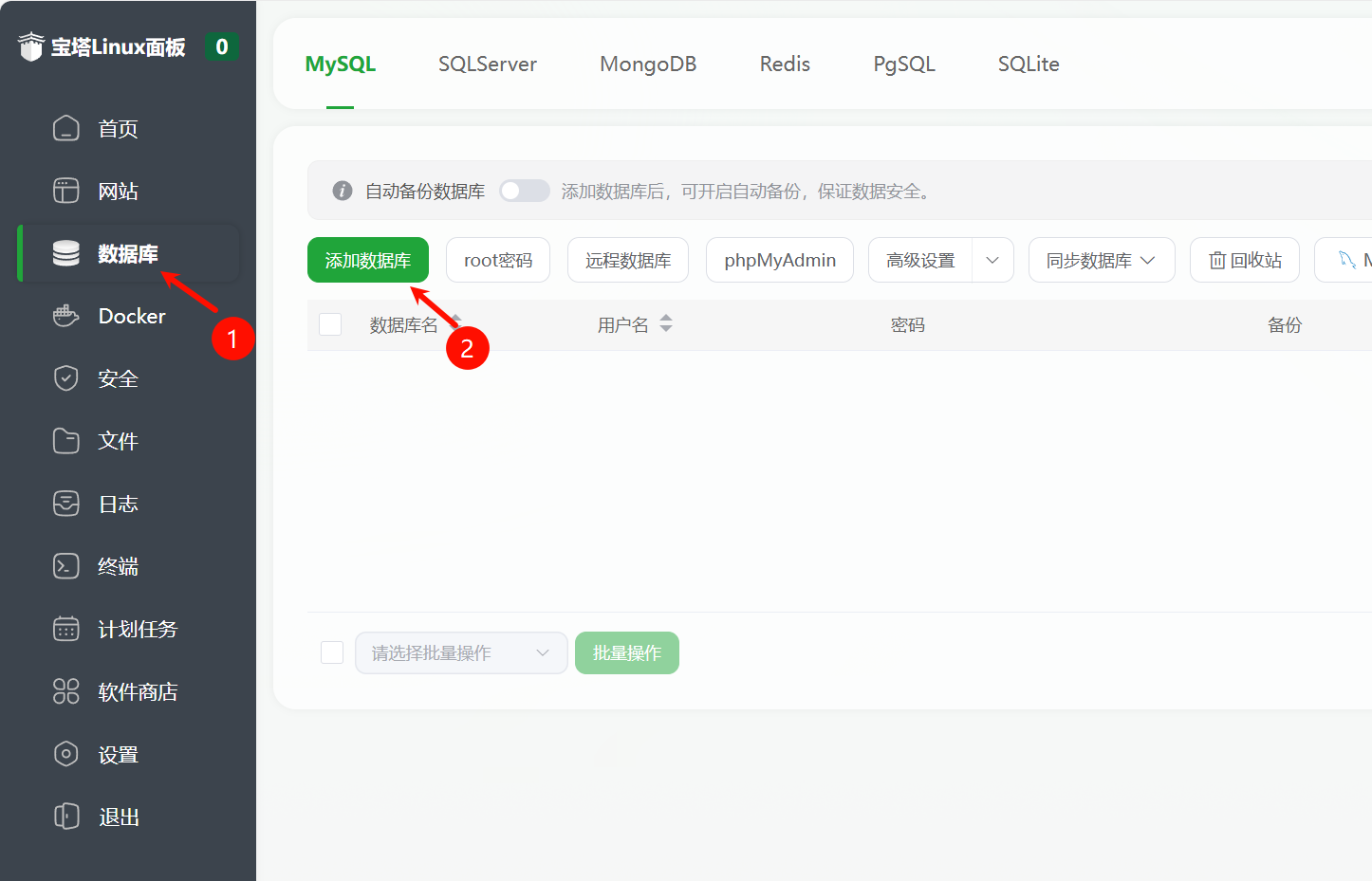 你以你的为准,宝塔会自动生成 MySQL 密码的,我们拷贝下来放到文本中,和 Redis 的密码一样等着备用。添加完成数据库之后,列表这里会新增一条的,如果密码没有记录着也是可以回来这里找到: