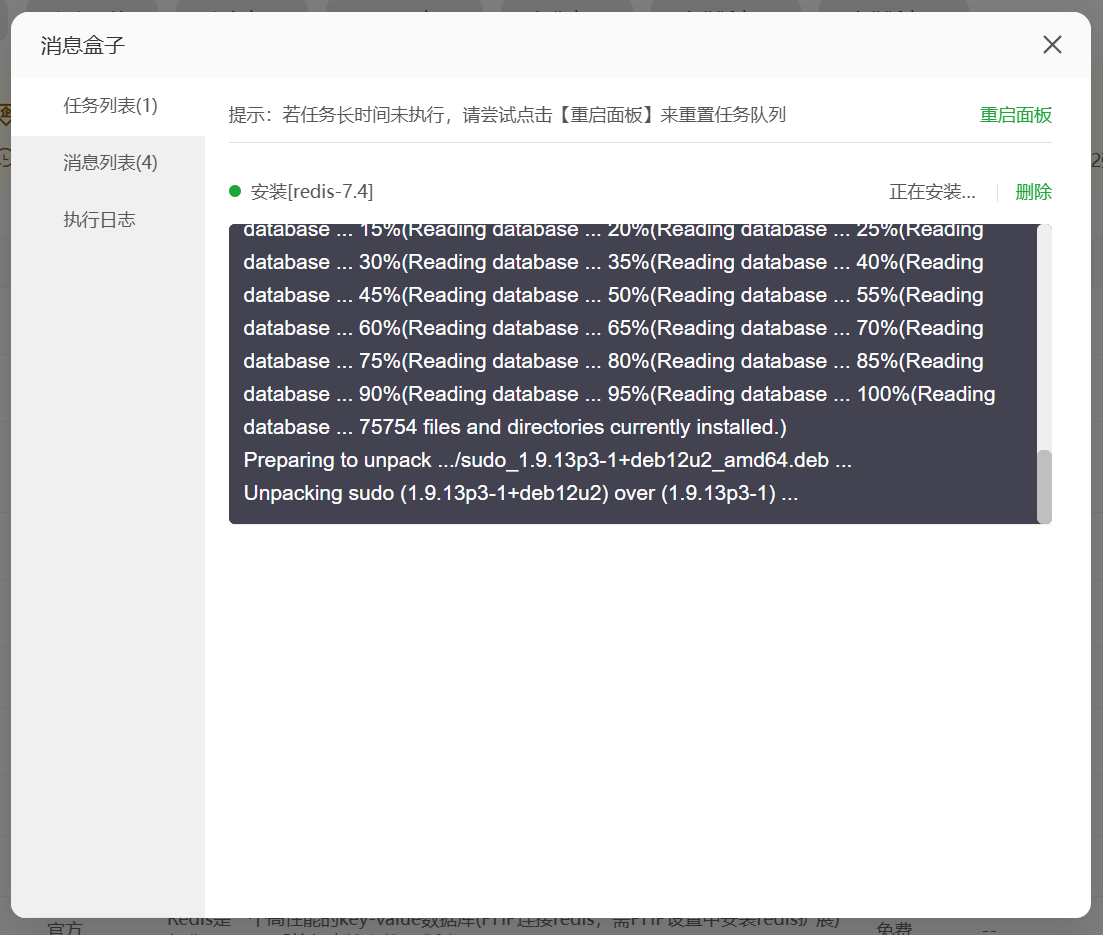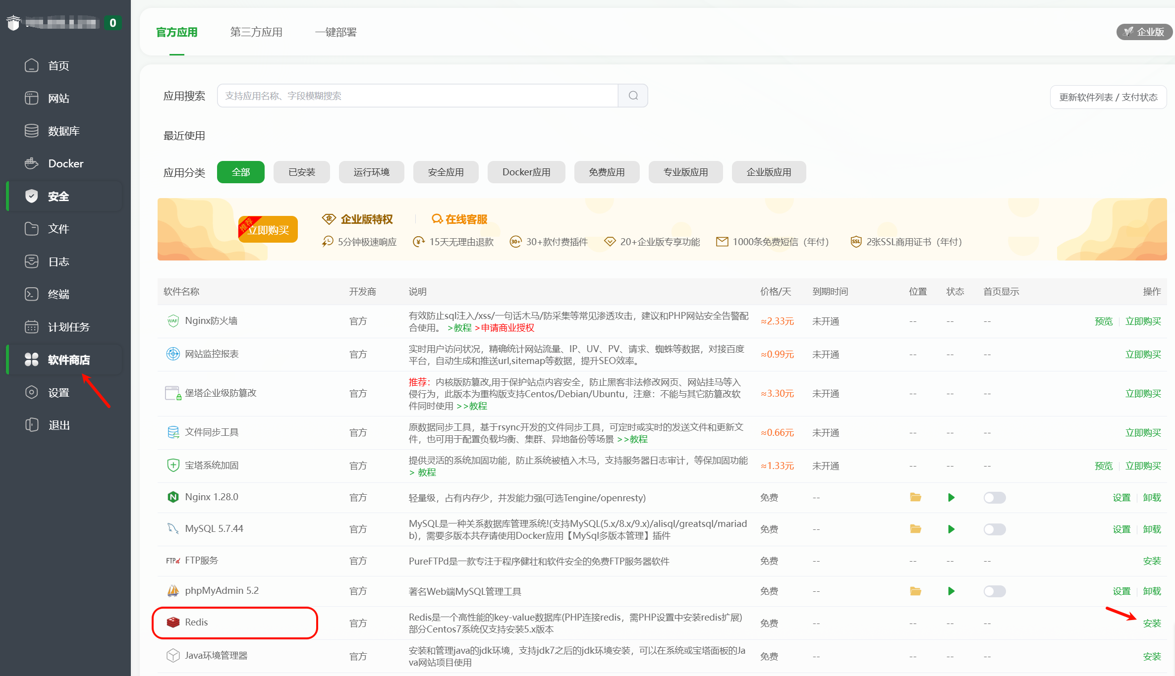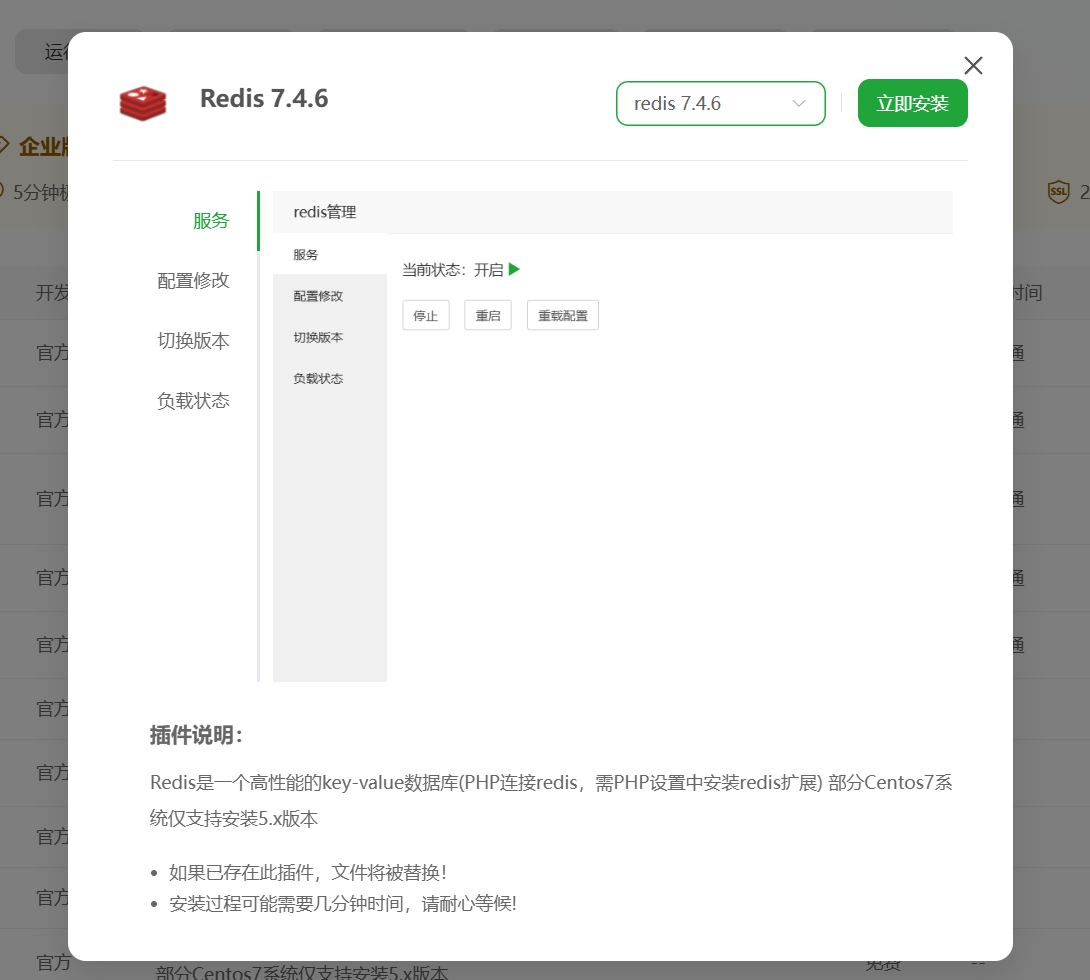 速度还能接受,客服系统后面还要安装一个 Redis,去到:软件商店-全部-找到 Redis。选择 7 系列的最新版,然后点击安装,等待完成。