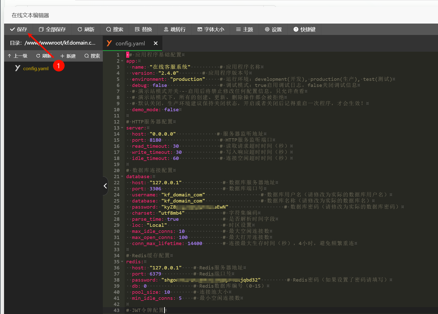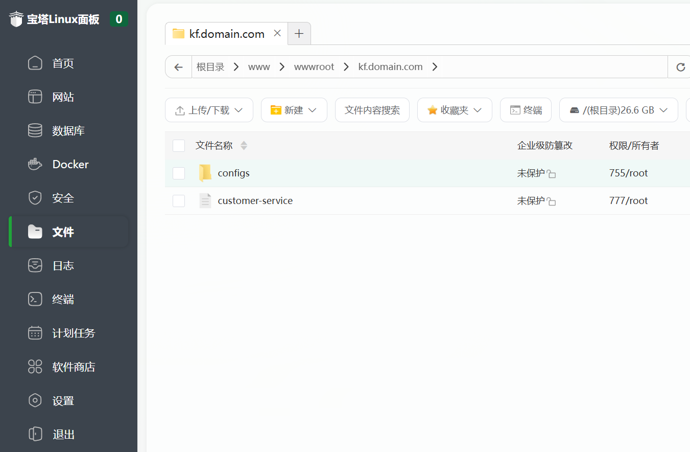 回到文件管理,进入 /www/wwwroot/kf.domain.com/configs 这个路径,你的目录名字不一定是我的这个,以你的为准。
