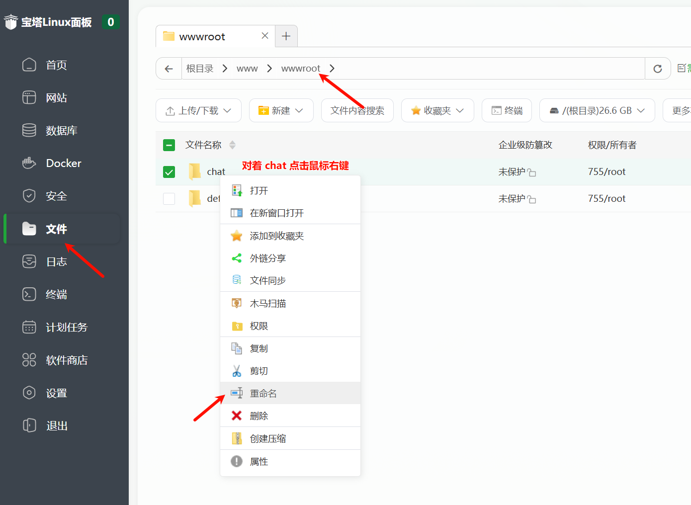完成后,相当于下载解压放在:/www/wwwroot/chat(可以自行修改目录 chat 的名字)