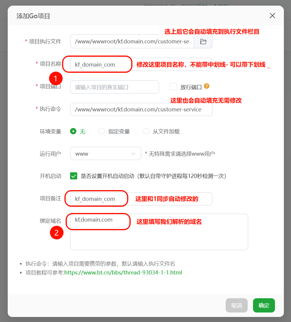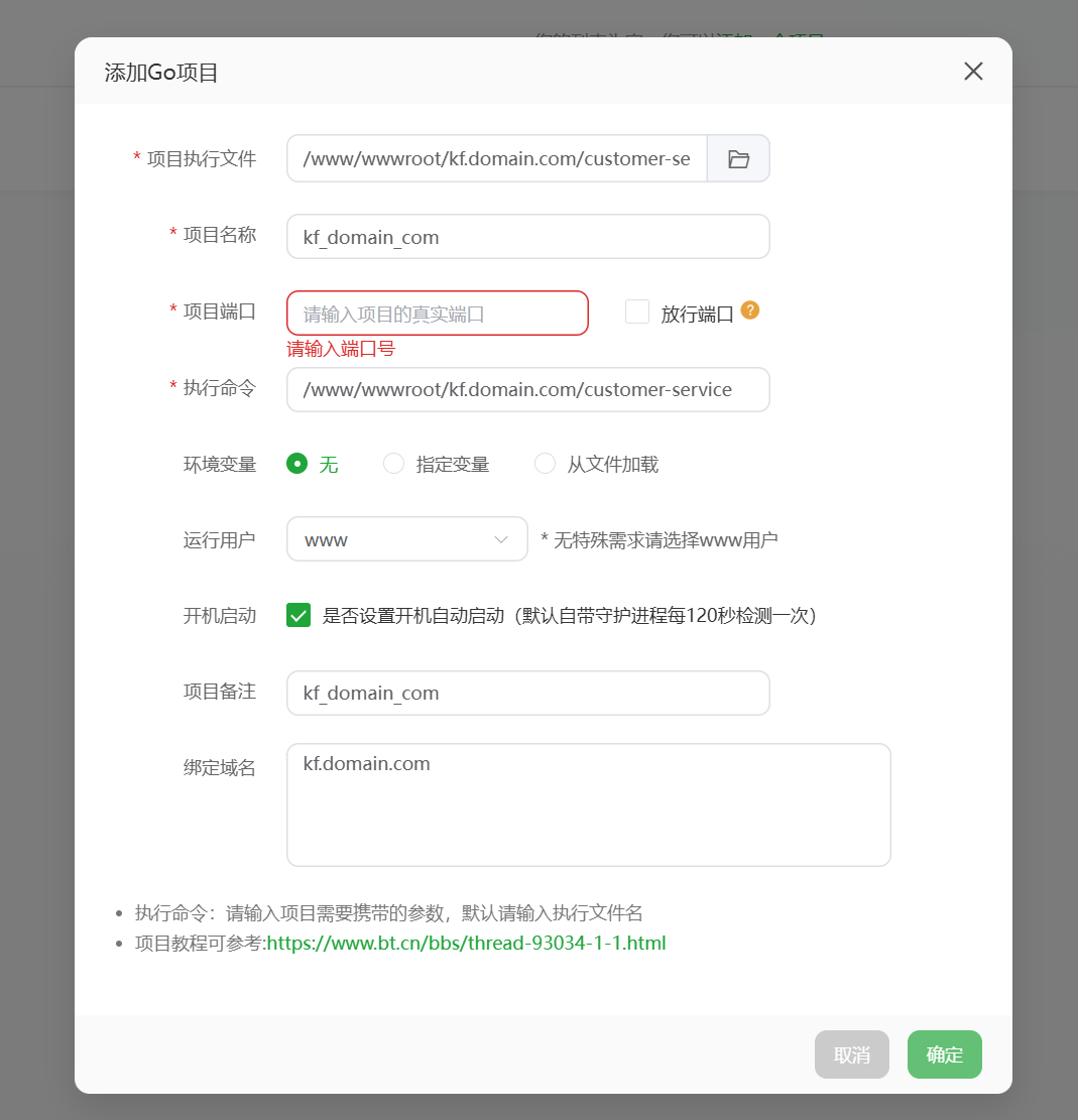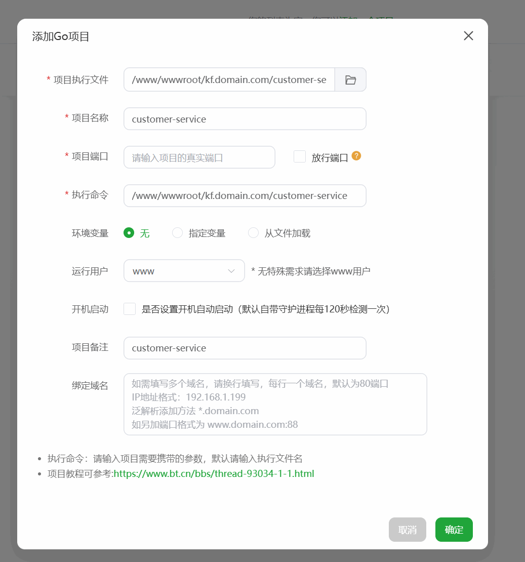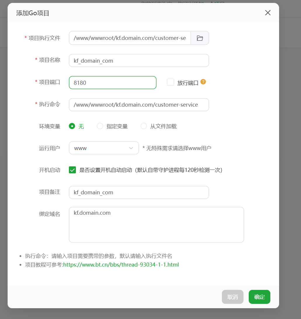 /www/wwwroot/chat/configs/config.yaml里面的 mysql 和 redis 连接信息。 - 宝塔-网站-创建 Go 项目,选上比如